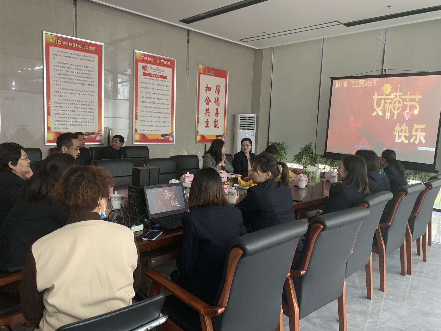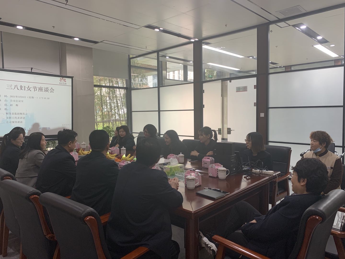 2021年3月8日上午,公司在会议室举办了三·八国际妇女节座谈会,会议由财务总监赵梅主持,公司领导及全体女工参会。